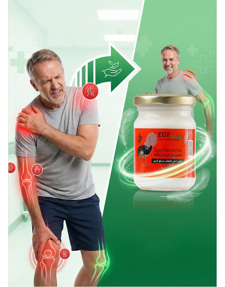 كريم دهن النعام من إيجي سفن هو كريم غني بدهن النعام الطبيعي المعروف بخصائصه الفعالة في تهدئة العضلات والمفاصل. يحتوي على الأحماض الدهنية الأساسية مثل أوميجا 3 و6 و9 التي تساعد على تقليل الالتهابات وتحسين مرونة المفاصل وتخفيف الشعور بالألم. يساعد الكريم على ترطيب البشرة بعمق وسرعة الامتصاص، كما يمنح إحساسًا بالراحة والاسترخاء بعد الاستخدام. مناسب للاستخدام اليومي للرياضيين وكبار السن أو لمن يعانون من آلام العضلات والمفاصل.